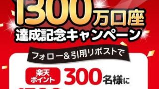 X懸賞 楽天証券1300口座CPで楽天ポイント1,300ポイントが300名様に当たる【X懸賞】〆切2025/11/25 楽天証券の1300口座突破記念キャンペーン【SNS懸賞】。楽天ポイント1,300ポイントが抽選で300名様に当たります。... 2025.11.12 X懸賞大量当選